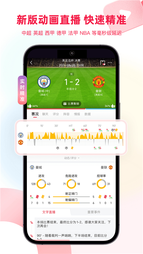 4、动画直播,准确即时还原赛场战况的动画直播、快速精准的战报集锦,会在比分改写后及时告诉你所钟爱球队和关注比赛的比分,让你不错过每一场精彩比赛;