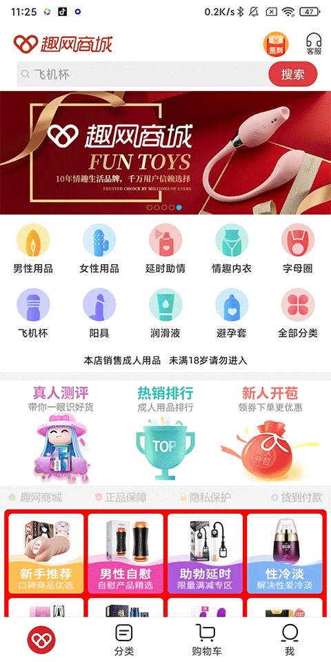趣网app是一款为成人提供生活用品的购物软件,内置丰富的内容,包含了1000多款不同的精品内容以及200+的人们品牌,能够满足用户夫妻情趣、闺蜜互动等多样化的需求。当用户通过软件进行了商品的购买后,不仅可以获得包裹的私密发送,还能够享受全国七大仓储网络实现高效配送,让用户在最短的时间内,收到自己购买的商品。现在新人注册进入软件,还将能够享受新人福利,以更少的价格购买自己心仪的商品。有需要的用户赶紧冲。