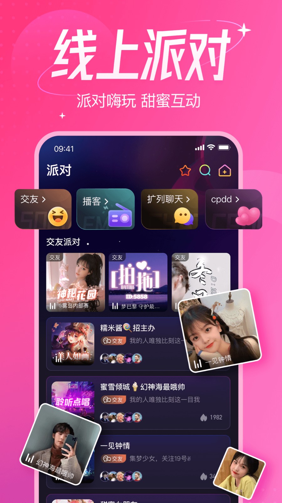 K歌,扩列,相亲海量娱乐派对,随时随地多人语音连麦畅聊。