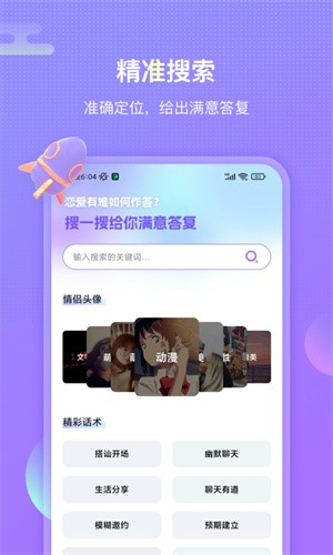 聊呗恋爱话术是一个恋爱聊天撩妹话术神器,帮助用户用真心话术打动你的心动女生,谈恋爱处cp,聊天很重要,在这里,你根本不用担心聊天。 内容丰富,海量的话术供您搜索,帮助解决聊天中各种实际问题,是你的贴心恋爱小帮手。